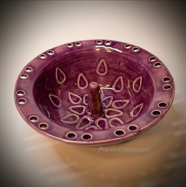 Wheel thrown. This beautiful and practical purple carved bowl can hold many pairs of earrings hung from the cutouts