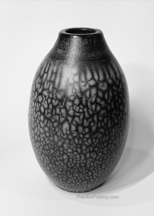 Naked Raku is a technique where slip (wet clay) is applied to a bisque fired pot and then refired. The slip cracks in the kiln and is then placed into a reduction chamber with combustible material such as sawdust or newspaper to create the crackled smoke stained effect.